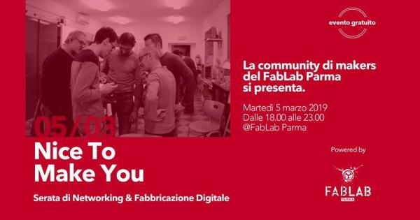 I “makers” sono persone portatrici di idee, know-how, competenze, abilità, esperienze, professionalità open source (hardware & software) nell’ambito della fabbricazione digitale e dell’innovazione tecnologica ma anche sociale. Ma…chi sono i makers del FabLab Parma? Che competenze hanno da mettere a disposizione reciproca e di tutta la community? Li conosciamo, ma soprattutto: tra di loro si conoscono? “Nice to make you!” è l’incontro gratuito e informale, pensato appositamente per far conoscenza, scambiarsi idee, contatti e progetti. Insomma, un’occasione per fare rete al di là di uno schermo. E sei non sei ancora iscritto o non hai mai messo piede in un FabLab…sei il primo a non poter mancare. Non siate timidi, vi aspettiamo! Iscrizione gratuita compilando il Form a questo link: https://goo.gl/JXEkD8 Per non farci mancare nulla, dalle 18.00 alle 20.30 puoi partecipare al primo appuntamento del format On/Off for Entrepreneurs: Luigi Galimberti e Massimo Ambanelli. La partecipazione è gratuita previa registrazione su Eventbrite a questo link: https://goo.gl/pJrWGY (non tergiversare, i posti sono limitati!) QUANDO & DOVE Martedì 5 marzo 2019 Orario: dalle 18.00 alle 23.00 FabLab Parma | Strada Naviglio Alto 4/1 | 43122 | Parma CONTATTI e-mail: corsi@officineonoff.com telefono: 0521. 270841