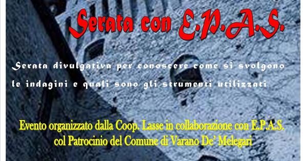 Serata all'insegna del mistero aperta al pubblico sabato 13 giugno presso il Castello Pallavicino di Varano de’ Melegari La serata con al centro una visita in notturna durante la quale verranno esposti il lavoro team E.P.A.S. ed i risultati dei sopraluoghi svolti in tutta Italia e anche al Castello Pallavicino di Varano de' Melegari dai membri dell'Associazione. I ricercatori illustreranno le apparecchiature e le tecniche utilizzate durante l'indagine notturna realizzata nella notte tra il 26 e il 27 luglio scorso compiuta al fine di verificare la presenza di possibili attività paranormali presso la struttura. E.P.A.S. è l’acronimo di European Paranormal Activity Society: si tratta di un gruppo di ricerca di fenomeni paranormali che si propone di indagare, con il massimo del rigore scientifico, tutti quei fenomeni inspiegabili definiti "paranormali”, le proprie ricerche sono state pubblicate da importanti testate giornalistiche, nonché utilizzate in svariati programmi tv. E.P.A.S. non è un gruppo di "cacciatori di fantasmi", ma un team di appassionati di ricerca sul paranormale, i loro studi sono rivolti a cercare di dare una spiegazione a tutti quei fenomeni strani che accadono, a questa attività e passione condivisa dai componenti del team, si affiancano la ricerca e la rivalutazione storico culturale del territorio, che si svolge mediante raccolta e successiva pubblicazione di foto e video dei luoghi visitati. Ingressi alle ore 21.00, 22.00, 23.00. Evento adatto ad un pubblico adulto. L'evento si terrà anche in caso di pioggia. La serata avrà un costo di partecipazione di € 10,00. È obbligatoria la prenotazione. Evento organizzato da Cooperativa Lasse in collaborazione con E.P.A.S. e col patrocinio del Comune di Varano de' Melegari. Informazioni e prenotazioni Cooperativa Lasse 366 6022442 info@lasse-coop.it www.castellodivarano.it