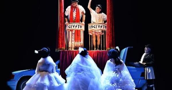 Qui il bersaglio satirico esplicito di Aristofane è l’arte oratoria e dialettica socratica e sofistica, con i suoi strumenti di convincimento e seduzione; ma quelli di cui ci si prende gioco ora sono più in generale i fabbricanti di verità, quelli che inducono l’uomo medio a fare, pensare, credere quello che desiderano. E in questa riflessione ironica e divertente sulle armi di persuasione di massa, sulla forza che le parole acquistano quando volte a fini non meritevoli, l’Ensemble conduce il pubblico in un percorso “on the road” verso la verità, che scopriremo mutevole e soggettiva. In scena giunge un carrozzone di comici, che catturerà il pubblico in un gioco meta-teatrale, in cui ciascun personaggio per essere vero, è falso: in fondo si è nel luogo della menzogna necessaria, della falsità per eccellenza, il teatro, in cui la verità diviene più vera del vero.