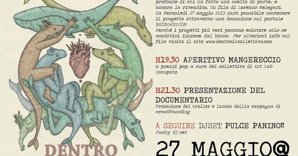 Mercoledì 27 maggio alle 21.30 verrà presentato ad Art Lab (Borgo Tanzi, 26 Parma) “Dentro il collettivo”, un documentario lungometraggio, al momento in fase di realizzazione, che ambisce a raccontare i giovani, la crisi, il mondo visto attraverso le lenti dei collettivi politici studenteschi e le esperienze di autogestione. Il progetto, curato da Lorenzo Melegari, ha già quasi tre anni di gestazione sulle spalle, durante i quali è stata raccolta un' ingente quantità di materiale, utile a strutturare una narrazione. Ora comincia la fase di postproduzione (montaggio, correzione colore, suono, ecc.) per sostenere la quale mercoledì viene lanciata una campagna di crowdfunding attraverso il portale Becrowdy.
