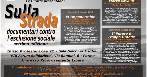 Giovedì 14 maggio alle 21 a Parma nella Sala “Giacomo Truffelli” di Forum Solidarietà (via Bandini, 6) s’inaugura la settima edizione della rassegna Sulla Strada - documentari contro l’esclusione sociale organizzata dall’associazione di documentazione sociale “Le Giraffe”.