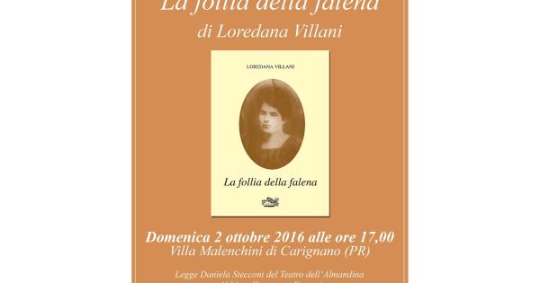 Domani, Domenica 2 Ottobre, alle ore 17, alla Villa Malenchini di Carignano (PR), Loredana Villani, poetessa parmigiana già protagonista di numerose iniziative in campo poetico a Parma e provincia, presenterà il suo nuovo libro di poesie, dal titolo "La follia della falena".