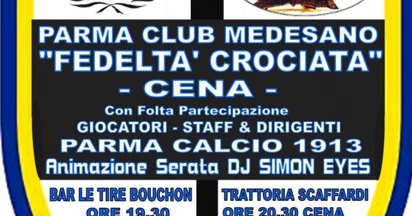 Il Parma Club di Medesano «Fedeltà Crociata» ha organizzato una serata in compagnia di giocatori e dirigenti del «Parma Calcio 1913». Alle 19,30 al bar «Le tire bouchon» di Felegara per l’aperitivo gialloblù. Quindi la cena alla trattoria Scaffardi di Varano Marchesi. Prenotazioni ai numeri 3468494315 e 3454672907.