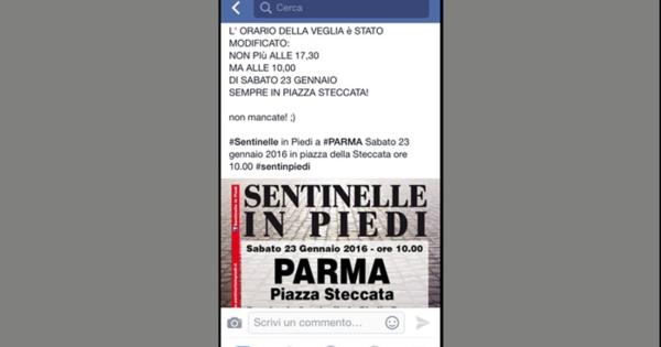 Le "sentinelle" anticipano la manifestazione in programma domani in piazza della Steccata, dedicata alle unioni civili. Si terrà alle 10 e non alle 17, sempre in piazza della Steccata.