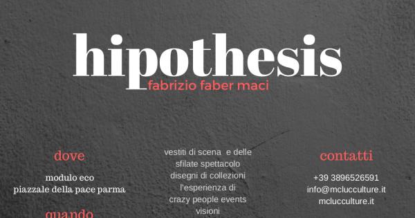 McLuc Culture presenta: Hipothesis - Esposizione di Fabrizio Faber Maci. Presso il Modulo Eco. P.le della Pace, Parma. Dal 9 al 23 Aprile 2017. Abiti di scena e delle sfilate spettacolo, disegni di collezioni, l'esperienza di crazy people events, visioni sull'ipotesi concettuale di un progetto abortito. Inaugurazione 9 Aprile ore 19.00 "Con Hipothesis c’è un percorso di ricerca durato 15 anni, tra sfilate spettacolo, abiti di costume per il teatro e per cortometraggi, collezioni per case di moda e performance che ipotizzano un vestire concettuale poi abortito 15 anni fa. I progetti interrotti hanno sempre un sapore amaro e mai concluso. E’ sospeso lì nell’aria come quando si spingono gli occhi di lato a cercare una ipotesi che possa ri-materializzarsi. Oppure che possa essere ripresa e darle nuova destinazione e ispirazione. " Biografia: Ideatore di McLuc Culture. Fashion designer, cesellatore designer argento, decorazione dei tessuti. In Italia e a Parigi. Direttore creativo, Cool Hunter. Trend book. Ricerca dei nuovi linguaggi e le culture urbane. Tra le sue esperienze: Teatro dilettantistico, costumista, doppiaggio, giornalismo, la radio. L'impegno politico e sociale. Promotore dell'affemazione della creativita' come messaggio per la sensibilizzazione sociale. Per la realizzazione collettiva e indipendente dei progetti culturali. Ha pubblicato tre raccolte di poesie, racconti, articoli sulla moda e le culture emergenti. Sfilate spettacolo, organizzazione di eventi dedicati alla creatività urbana. Modulo Eco. P.le della Pace, Parma. Inaugurazione 9 Aprile ore 19.00