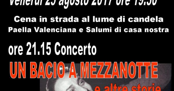 MUSEO UOMO AMBIENTE - BAZZANO (PR) Venerdì 25 agosto 2017 ‘I Segreti della Notte’ Cena in strada al lume di candela Raccontastorie della notte per i bimbi Concerto UN BACIO A MEZZANOTTE e altre storie ai tempi di GORNI KRAMER Proseguono gli appuntamenti musicali del Museo Uomo Ambiente di Bazzano (Parma), con il concerto UN BACIO A MEZZANOTTE e altre storie ai tempi di GORNI KRAMER Omaggio al grande fisarmonicista, compositore e direttore d'orchestra, e alla musica italiana della prima metà del secolo scorso. In repertorio alcune delle canzoni e musiche più celebri del '900 di cui Kramer è stato uno degli autori di spicco ed altri successi dell' epoca d'oro dello swing italiano e della musica d' autore degli anni cinquanta. Esecutori d'eccezione la duttile voce di LORENZA GAMBINI, il prezioso piano di DOMENICO MIRRA, il virtuosismo alla tromba di FRANCO CAPILUPPI, la solida base ritmica di ORAZIO AROLDI al contrabbasso e MASSIMO SAVIOLI alla batteria. Il concerto si colloca all’interno dell’iniziativa ‘I segreti della notte’ organizzata dal Gruppo Culturale ‘Il Camino’ che prevede una cena in strada al lume di candela, con paella Valenciana e Salumi d casa nostra, con inizio alle 19.30 e il ‘Raccontastorie della Notte’, (ore 21.00) per i bambini, col teatrino Kamishibai L’inizio concerto è previsto per le ore 21.15 Per informazioni: tel. 333 4504976 – museo@museouomo-ambiente.it - facebook; Museo Uomo Ambiente (Bazzano, Parma)