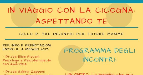 È in partenza dal giorno lunedì 8 Maggio 2017 ore 18,00 – 20,00 un ciclo di 3 incontri rivolto alle mamme in attesa. Gli incontri, che saranno condotti da due psicoterapeute, si pongono come obiettivo quello di stimolare il confronto e la riflessione su tematiche importanti per le nuove mamme. PROGRAMMA: 1 INCONTRO: La bambina che ero 2 INCONTRO: Una pancia di emozioni 3 INCONTRO: Fantasticando su di te... IN PARTENZA DA LUNEDI' 8 MAGGIO DALLE 18.00 ALLE 20,00 A CADENZA SETTIMANALE Costo di partecipazione: 45 euro tre incontri (20 euro singolo incontro). Il gruppo prenderà avvio con un numero minimo di 5 partecipanti PER INFO E PRENOTAZIONI ENTRO IL 4 MAGGIO 2017: - Dr.ssa Elisa Piovani Psicologa e Psicoterapeuta 349.4640984 - Dr.ssa Sabina Zapponi Psicologa e Psicoterapeuta 347.0561827 - itacapsicologiparma@gmail.com