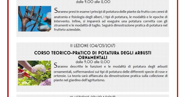 Sabato 4 marzo - ore 9-12. Corso teorico-pratico di potatura degli arbusti ornamentali. Saranno descritte le funzioni e le modalità di potatura degli arbusti ornamentali, soffermandosi sui tipi di potatura delle differenti specie di rose e ortensie. La teoria sarà affiancata da dimostrazione pratica sulle collezione di piante nel giardino dell’agriturismo.