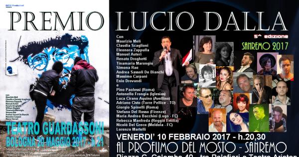 Premio Lucio Dalla sbarca a Sanremo 2017. Sanremo: Venerdì 10 Febbraio, nella sala "Il Profumo del Mosto" di Piazza Colombo a Sanremo, arriva Premio Lucio Dalla con tutto lo staff nazionale e vari artisti da tutta Italia. Un'occasione straordinaria per il patron Maurizio Meli per accendere le cinque candeline del Premio insieme alla madrina ufficiale Claudia Scaglioni, cugina di Lucio Dalla, e tutto il resto del team storico composto da Eleonora Zappulla, responsabile nazionale per le selezioni regionali, Manuel Auteri discografico della SanLuca Sound e cantautore, Renato Droghetti produttore musicale, collaborazioni per Vasco Rossi con Gaetano Curreri, già arrangiatore per nomi prestigiosi come Bennato, Meneguzzi e altri nazionali, Alessandra Boni, marketing del Premio, Tinamaria Marongiu del Cenacolo di Ennio Melis (ex RCA), Simona Rae voce della nazionale Orchestra Casadei, Andrea Sassoli De Bianchi dell'Ass.ne "C'è una chitarra per te" e Massimo Carpani prestigiosa firma di vari dischi di Dalla, Guccini e altri grandi del panorama della musica cantautorale italiana. Sarà una serata dai ritmi serratissimi visto il numero dei partecipanti che, oltre a presentare i propri lavori musicali, interpreteranno anche delle cover di Lucio Dalla tra le più belle e rappresentative spaziando da 4 marzo 1943 a Futura, da La sera dei Miracoli a La casa in riva al mare e tante altre. Si esibiranno artisti appunto da tutta Italia tra nuovi partecipanti alla corrente 5^ edizione e delle precedenti. Ed ecco i nomi: Pino Paolessi (Roma), Antonello Frongia (Iglesias), Luca Aquino (Avellino), Adriano Cisto (Torre Pellice - TO), Giorgio Spinelli (Roma), Stefano Del Rosso (Firenze), Maria Andrea Bacchini (Lugo D.R. - FC), Rebecca Manfreda (Reggio Emilia), Nicolò Del Greco (Meldola - FC) e il lirico Lorenzo Martelli (Tagliacozzo - AQ) in rappresentanza dell'autrice Marina La Valle. Dello staff si esibiranno Manuel Auteri, Tinamaria Marongiu, Andrea Sassoli De Bianchi e Simona Rae. Tra gli ospiti anche Enio Drovandi, attore, produttore artistico e talent scout nazionale. La serata si concluderà, come tradizione da 5 anni, con l'interpretazione de L'anno che verrà da parte di tutti i cantanti capitanati dal patron Maurizio Meli. Serata dunque pienissima di artisti e musica che, dopo 5 anni, consacrerà Premio Lucio Dalla in seno al cuore pulsante della musica italiana per uno straordinario ulteriore omaggio al grande Maestro e Poeta scomparso.