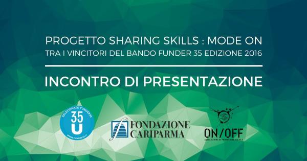 Funder35 è il bando promosso da ACRI (Associazione di Fondazioni e Casse di Risparmio Italiane), giunto alla sua sesta edizione. All’incontro parteciperanno Simone Taddei, referente dell’associazione On/Off per il progetto “Sharing Skills: Mode On” e Alfredo Avanzini, consigliere di Fondazione Cariparma delegato per FUNDER35.