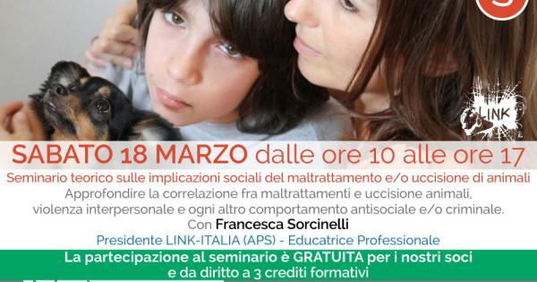 Correlazione fra maltrattamento e/o uccisione di animali, violenza interpersonale e ogni altro comportamento antisociale o criminale. Con la parola Link si indica il legame fra crudeltà su animali e crimine, con particolare riguardo al crimine violento, compreso l’omicidio e la violenza domestica su donne e minori. I Casi Link sono i comportamenti annoverabili in tale categoria. Il link sarà il tema dell'importante seminario tenuto dalla Dott.ssa Francesca Sorcinelli, presidente di Link-Italia (APS), Educatrice Professionale presso Comunità Semiresidenziale per Minori. Il seminario si svolge a Bologna, è gratuito per i soci SIUA e dà diritto a 3 crediti formativi. Per info: 0516661562 | 3402513890 oppure info@lykos.education