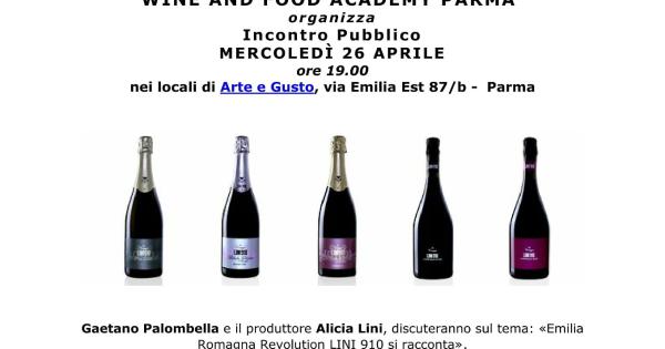 La Wine and Food Academy, nell'ambito delle sue iniziative, finalizzate a contribuire a stimolare la discussione sui temi dedicati al buon vino e al buon cibo, a Parma città creativa per la Gastronomia UNESCO, organizza per Mercoledi 26 Aprile 2017 alle ore 19,00 nei locali di Arte & Gusto siti in Via Emilia Est, 87: Emilia Romagna Revolution, LINI 910 si racconta. il produttore Alicia Lini presenterà la sua azienda e i suoi innovativi metodi di vinificazione mentre il sommelier Gaetano Palombella guirderà una degustazione di ben cinque etichette prodotti dalla LINI 910. L'Incontro è gratuito e aperto a tutti gli enogastronauti.