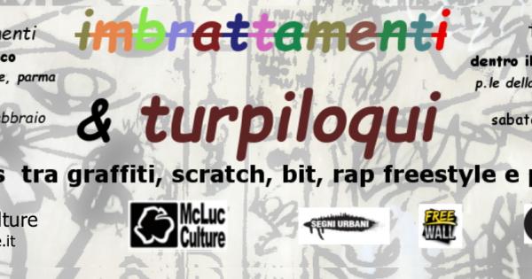 Turpiloqui è organizzata in collaborazione con il gruppo di "La poesia è terra libera" incontri di reading di poesia itineranti. Quello che ci appare sconosciuto o incomprensibile viene considerato come una possibile minaccia. Non sempre è così e a causa di questo il pregiudizio può condurre a un disagio. Imbrattamenti e turpiloqui è ispirato al fraintendimento generato dai pregiudizi. Il pregiudizio è trasversale e lo si può incontrare in qualsiasi ambito. Si giudica in modo errato ciò che non rientra nella nostra visione del mondo. Imbrattamenti e turpiloqui sono solo due parole convenzionalmente riconosciute come negative. Dietro di esse però può nascondersi qualcosa di sorprendente, di inaspettato, di strabiliante. Imbrattamenti e turpiloqui vuole smentire gli stereotipi che molto spesso impediscono di vedere al di là del nostro orizzonte. Stereotipi che preferiscono il grigiore alla fantasia e al colore, la noiosa ovvietà alla scoperta attraverso la forza creativa della poesia. Graffiti, rap freestyle, scratch, poesia, contaminazioni tra forme di espressione apparentemente diverse. Due giornate dedicate alla creatività urbana in Piazzale della Pace presso il Modulo Eco a Parma. Gli Artisti dell’Associazione Culturale McLuc Culture occuperanno la struttura avvolgendola di colori e parole. Aperta a tutti, entrata libera.