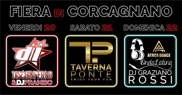 Weekend di fuoco... Corcagnano in Sagra 20-21-22 luglio, 3 giorni di eventi per tutti i gusti! ? VENERDI 20 dalle 22:00 con il concerto dei DiscoInferno e a seguire Dj Frambo vi farà ballare fino a notte fonda. ? SABATO 21 Si balla con la grande musica made in Taverna Ponte 2.0 disco in tour con DJ Andrea Carpi e DJ Marco Silva ? DOMENICA 22 spettacolo e animazione per bambini con la scuola di danza New Space Danza e Musica e a seguire serata con Ondalatina e DJ Rossi Graziano, esibizione della scuola Javi Fernan e Alice Sirosi - ATACA DANCE - ?TUTTE LE SERE cucina tipica: ?Tortelli di erbetta Prosciutto e melone Roastbeef Patatine fritte Verdure grigliate Fritto misto Pizza per tutti i gusti!!! Servizio Bar