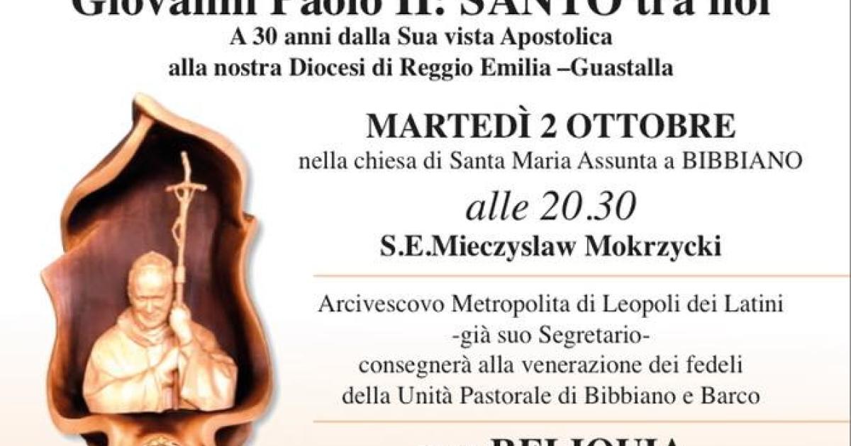 Nella chiesa parrocchiale di Santa Maria Assunta del paese della Val d'Enza reggiana, alle 20,30, Mieczyslaw Mokrzycki - arcivescovo metropolita di Leopoli dei Latini, già segretario del pontefice - "consegnerà alla venerazione dei fedeli dell'Unità pastorale di Bibbiano e Barco una reliquia di s. Giovanni Paolo II". Il prelato presiederà una messa solenne.