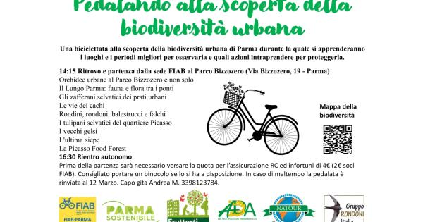 FIAB Parma, Parma Sostenibile, Fruttorti Parma, ADA associazione donne ambientaliste, Natour Biowatching e il Gruppo Rondini & Rondoni Parma propongono l’iniziativa “Pedalando alla scoperta della biodiversità urbana”. Si tratta di una biciclettata alla scoperta della ”natura in città” con la guida di esperti naturalisti e di volontari appassionati. Sabato 26 febbraio il ritrovo dei partecipanti sarà alle ore 14.15 in via Bizzozero 19 a Parma con rientro autonomo alle 16.30.