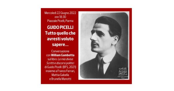 Mercoledì 22 giugno alle 18,30 in piazzale Picelli a Parma si terrà l'incontro "Guido Picelli. Tutto quello che avresti voluto sapere...". Sarà una conversazione con William Gambetta intorno al libro "La mia divisa. Scritti e discorsi politici di Guido Picelli" (BFS, 2021) insieme a Franco Ferrari, Mattia Gabella e Brunella Manotti. A cura del Centro studi movimenti, Chourmo Enolibreria e Barrique Piazzale Picelli.