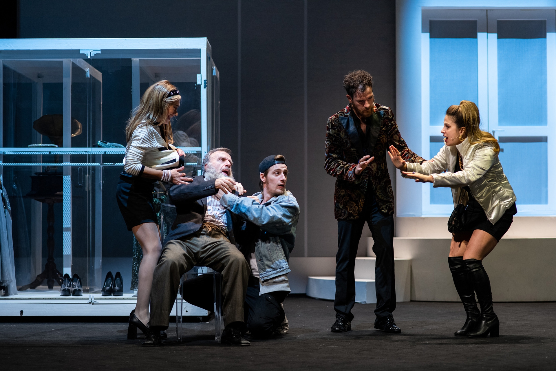La regia di Saravo ambienta lo spettacolo in una dimensione che rimanda al nostro quotidiano, giostrando riferimenti temporali diversi, dagli smartphone agli abiti anni Settanta agli spot che tormentano Arpagone (la pubblicità è il diavolo che potrebbe indurlo nella tentazione di spendere il suo amato denaro). Anche le musiche originali di Paolo Silvestri si muovono su piani diversi, mentre la nuova traduzione di Letizia Russo, fresca e diretta, contribuisce a dare al tutto un ritmo contemporaneo.