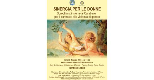 Per la Giornata internazionale della Donna, Soroptimist Club Parma organizza una conferenza in collaborazione con il Comando provinciale dei carabinieri di Parma sulle azioni e le strategie possibili per il contrasto alla violenza di genere. L’incontro si terrà venerdì 8 marzo alle 17 nella sede del Comando dei carabinieri di Parma, all’interno del Palazzo Ducale (ingresso dal Parco Ducale). Ingresso libero.