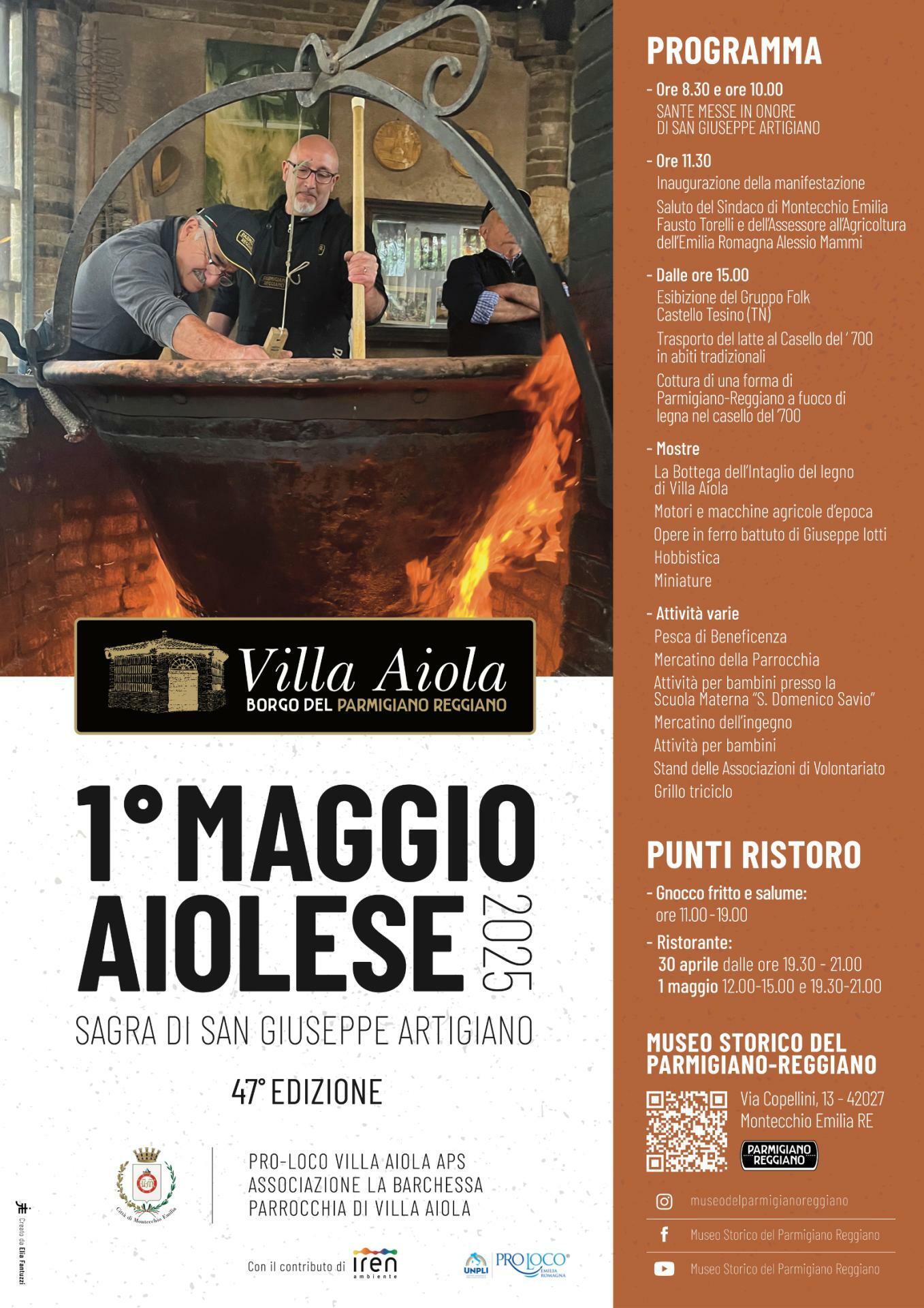 Giovedì a Villa Aiola andrà in scena la 47ª edizione del 1° Maggio Aiolese, sagra di San Giuseppe artigiano. L’associazione culturale “La Barchessa”, la Pro Loco Villa Aiola e la parrocchia, con il patrocinio del Comune di Montecchio Emilia e del Consorzio del Parmigiano Reggiano, hanno unito le forze per realizzare questo evento, tra i più importanti della frazione assieme alla Sagra del Patrono e alla fiera di paese, riproponendo antichi mestieri artigianali e promuovendo la vendita dei prodotti agricoli locali.