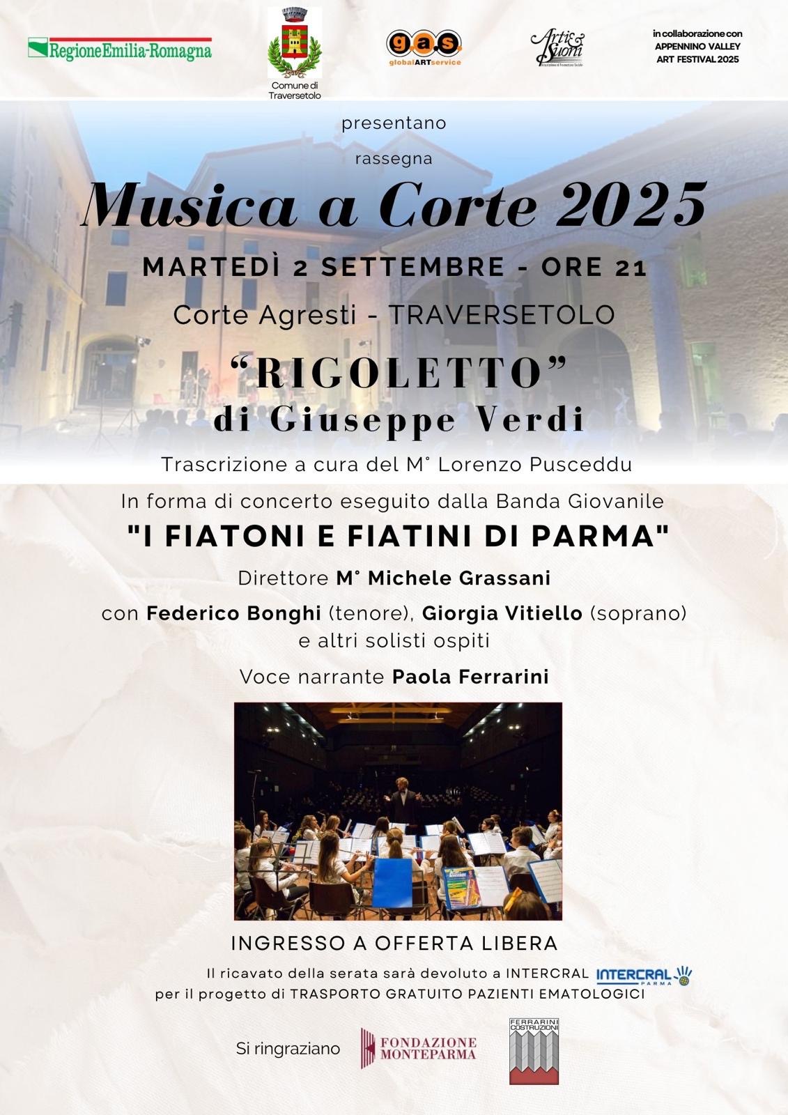 La rassegna “Musica a Corte” prosegue martedì 2 settembre, alle 21, con Rigoletto di Giuseppe Verdi. Il concerto, a cura di Arti e Suoni Aps Scuola di Musica, vedrà la partecipazione della banda giovanile I Fiatoni e Fiatini di Parma, che presenterà un’interessante rilettura in forma di concerto del Rigoletto di Giuseppe Verdi su trascrizione originale per orchestra a fiati a cura del M° Lorenzo Pusceddu. L'allestimento vedrà la direzione del M° Michele Grassani con la collaborazione di giovani cantanti del Conservatorio "A. Boito" di Parma. Con Federico Bonghi (tenore), Giorgia Vitiello (soprano) e altri solisti ospiti. Voce narrante: Paola Ferrarini. In collaborazione con Appennino Valley Art Festival 2025.