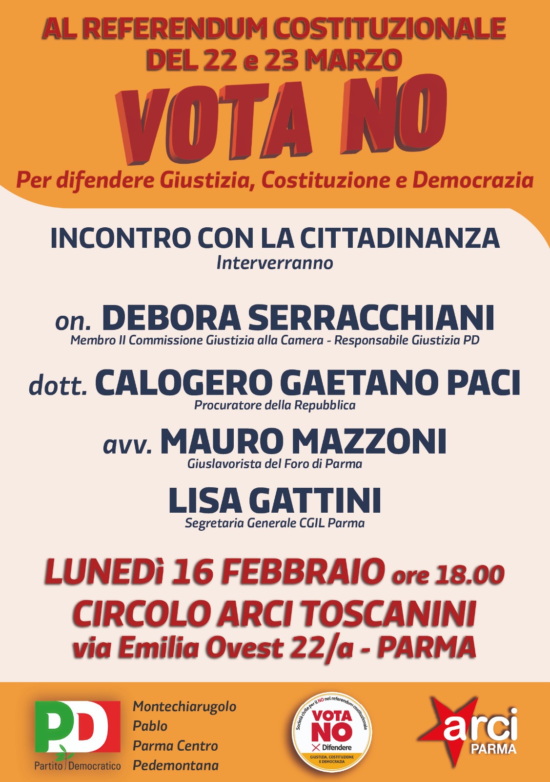 L’onorevole Debora Serracchiani sarà a Parma lunedì 16 febbraio, alle 18, al Circolo Arci Toscanini in via Emilia Ovest, per sostenere il Comitato per il NO al referendum del 22 e 23 marzo. L’incontro pubblico, dal titolo “Vota No, per difendere giustizia, Costituzione e democrazia”, è organizzato dai circoli Pd di Montechiarugolo, Pablo, Parmacentro e Pedemontana, insieme al Comitato provinciale per il NO e ad Arci Parma.