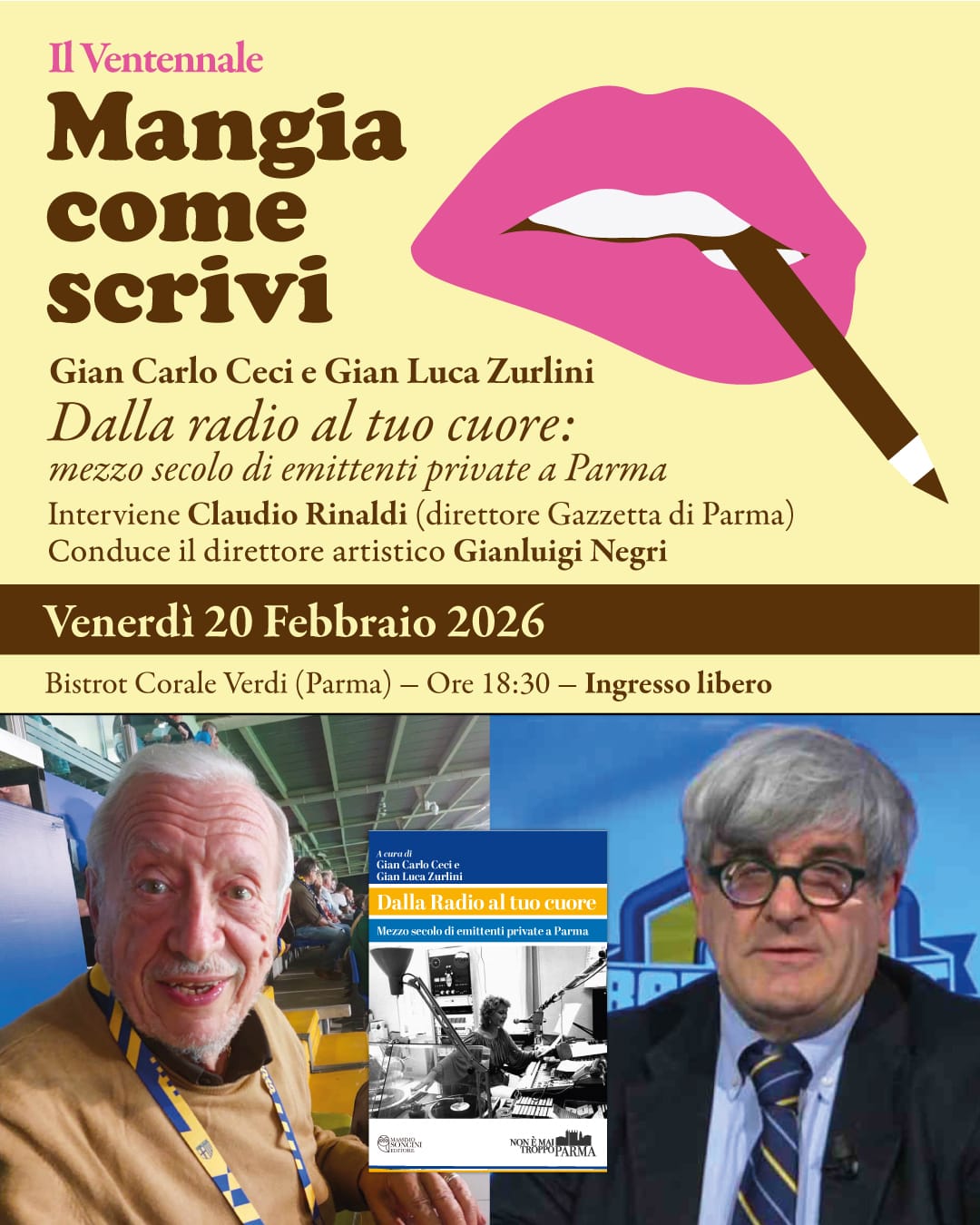 Mezzo secolo di storia di Parma, ma anche mezzo secolo di storia e storie italiane. Perchè Radio Parma è stata la prima radio libera a trasmettere nel nostro Paese (1° gennaio 1975), perchè la prima radiocronaca completa di una partita di calcio (non Rai) andò in onda su Radio Emilia Uno l’11 gennaio 1976 con l’inviato Gian Carlo Ceci, perché nelle radio di Parma si sono formati conduttori e giornalisti che negli anni si sono ritagliati meritati spazi e visibilità a livello nazionale (uno su tutti, Mauro Coruzzi, in arte Platinette, Premio Mangiacinema Pop nel 2021). Il secondo appuntamento dell’anno di Mangia come scrivi, che dallo scorso novembre sta celebrando il proprio ventennale, si terrà venerdì 20 febbraio al Bistrot Corale Verdi di Parma, e sarà caratterizzato da un’anteprima assoluta: la presentazione del libro “Dalla Radio al tuo cuore - Mezzo secolo di emittenti private a Parma” (Massimo Soncini Editore), curato dai giornalisti Gian Carlo Ceci e Gian Luca Zurlini, in uscita il giorno successivo, distribuito in edicola dalla Gazzetta di Parma a 14 euro più il prezzo del quotidiano. Interverrà alla serata anche il direttore della Gazzetta di Parma, Claudio Rinaldi.