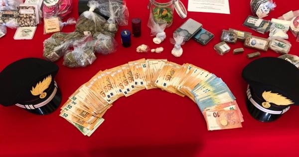 Nel corso della perquisizione domiciliare i Carabinieri hanno rinvenuto in vari nascondigli e sequestrato un totale di oltre 700 grammi di stupefacenti, di cui 400 di hashish in panetti (con lo stesso marchio di quello sequestrato al primo acquirente), 300 di marijuana già essiccata e 50 grammi di cocaina, in parte già pronta in dosi da un grammo.