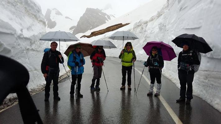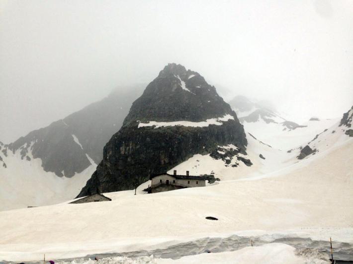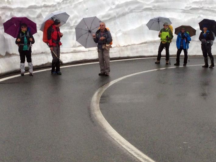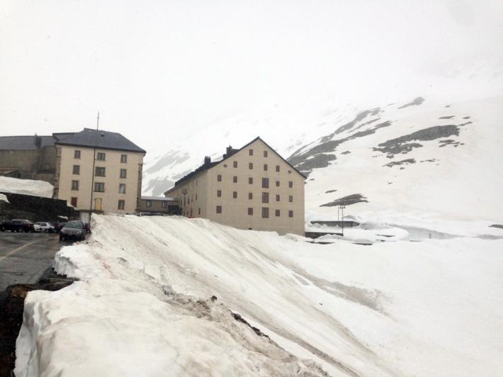 Arrivati questa mattina in pulmino. Il colle del Gran San Bernardo è ancora chiuso al traffico auto. Scaricati a quota 1800 m sotto i tornanti e saliti su asfalto fino al passo 2473 m per oltre 7 chilometri, accompagnati da un pioggia sottile che è diventata neve nell'ultimo tratto. In compagnia di marmotte e volpi e qualche gruppo di pellegrini in discesa.