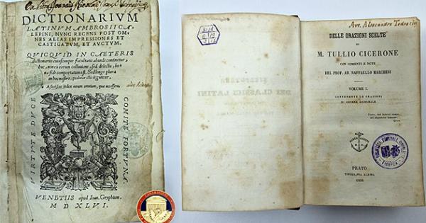 Si tratta di due volumi: il primo, un testo a stampa in latino dal titolo “Dictionarium Latinum Ambrosii Calepini, nunc recens post omnes impressiones et castigatum, et auctum”, pubblicato a Venezia nel 1546, opera di natura lessicografica ed enciclopedica sulla lingua latina scritta dall’umanista Calepino Ambrogio detto “Calepino” (1435-1510). Il secondo è un testo a stampa in italiano-latino dal titolo “Delle orazioni scelte di M. Tullio Cicerone” con commenti e note di Don Raffaele Marchesi (Magione 25/02/1810 – Firenze 08/07/1871), presbitero, insegnante e scrittore impegnato nella costituzione delle scuole notturne, destinate all’emancipazione sociale delle classi popolari perugine dell’Ottocento; pubblicato dalla tipografia Aldina di Prato, l’opera raccoglie, rilegati, i due testi “Orazioni di genere giudiziale” (1856) e “Orazioni di genere deliberativo” (1859).