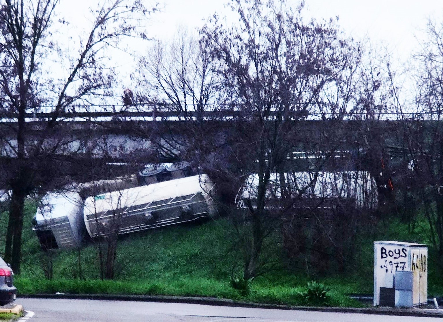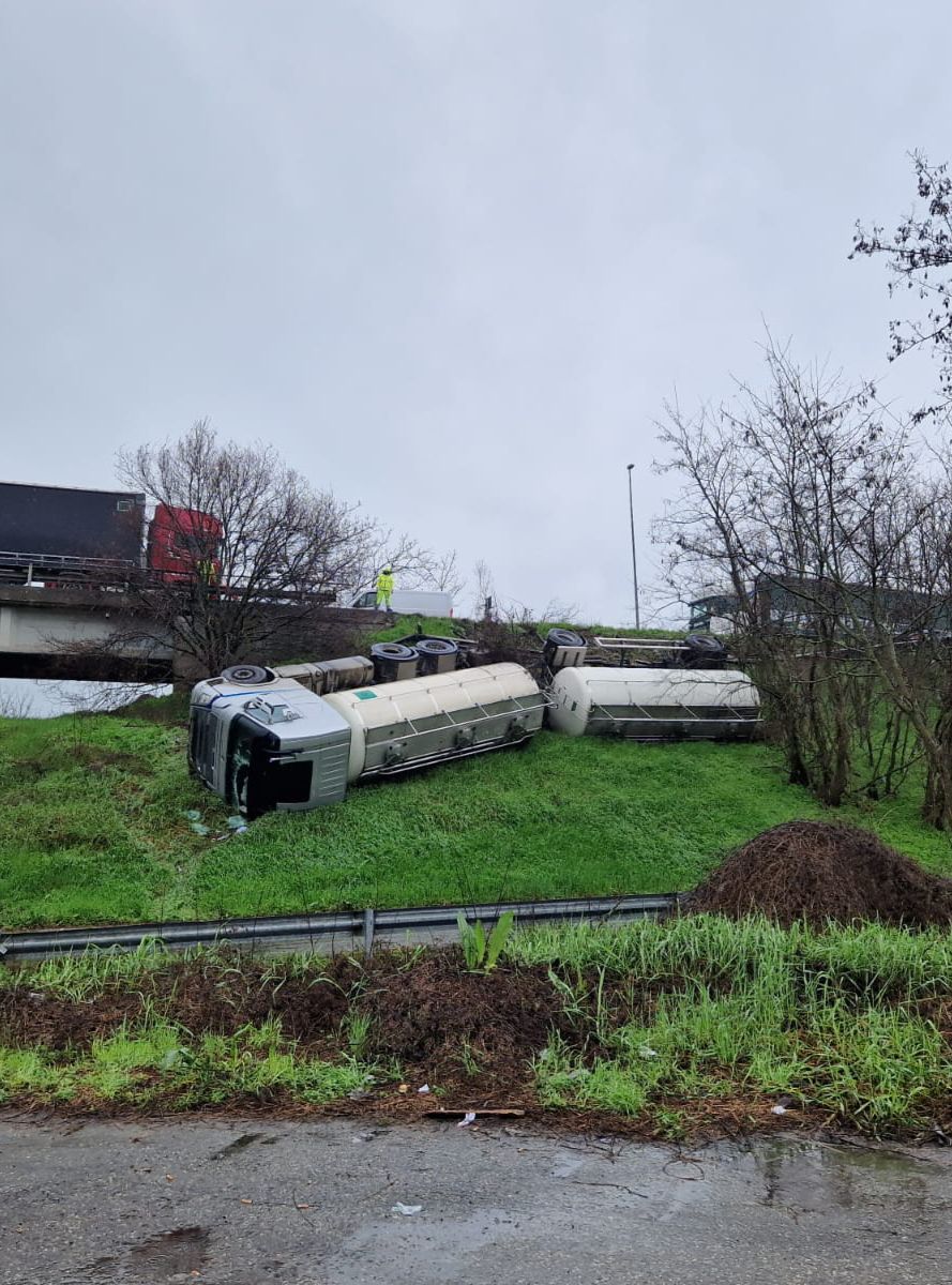 Spaventoso incidente a Fidenza. Un camion con rimorchio si è ribaltato nella scarpata del cavalcavia della tangenziale. L'autista è miracolosamente illeso.