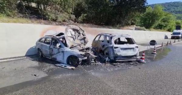 Il luogo dell'incidente, qualche chilometro dal casello di Fornovo, con le due auto carbonizzate: uno dei due conducenti è morto, l'altro si è salvato.