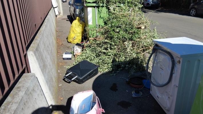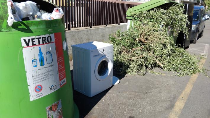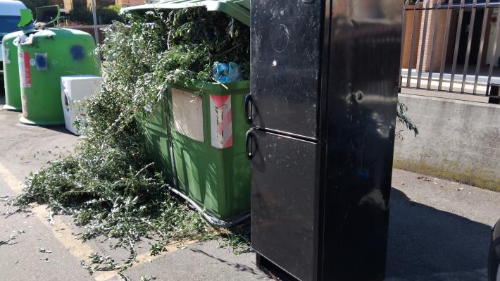 Accanto ai bidoni del verde e del vetro sono "spuntati" alcuni rifiuti casalinghi fra cui un frigorifero nero e una lavatrice. Sono stati abbandonati oltre ad altri sacchi, una valigia e diversi rami secchi. La segnalazione arriva da un residente del quartiere San Leonardo.