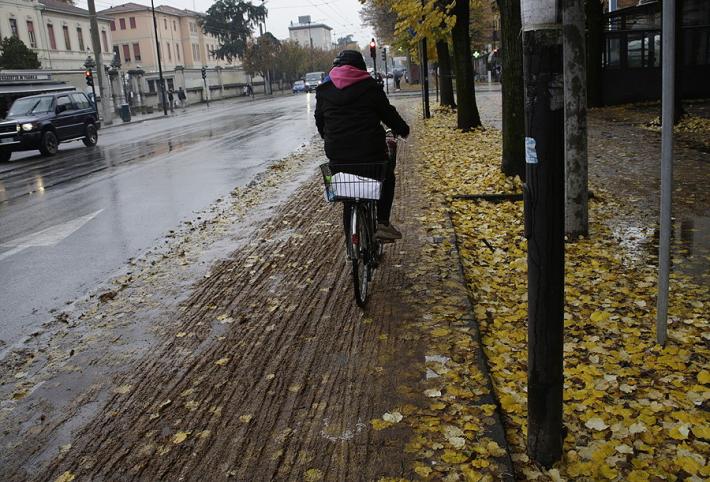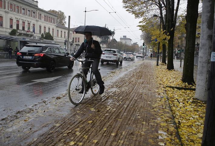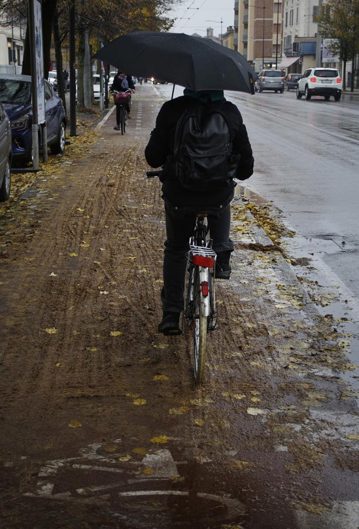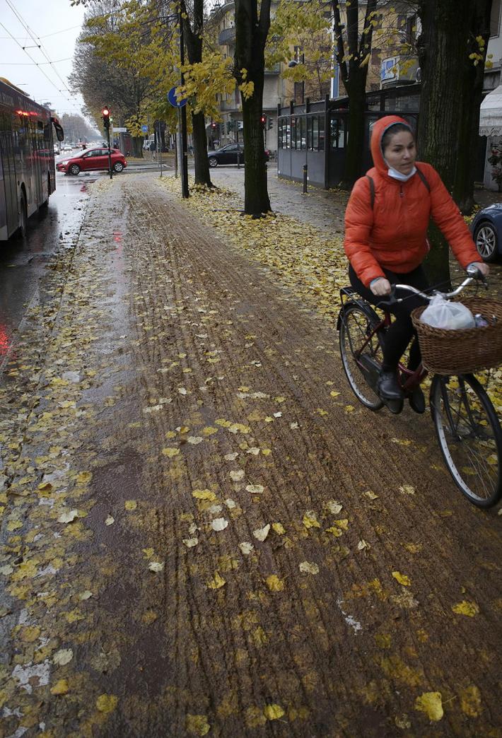 Pista ciclabile pericolosa causa poltiglia di foglie via Gramsci fronte ospedale, un'ora fa