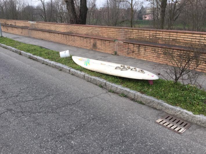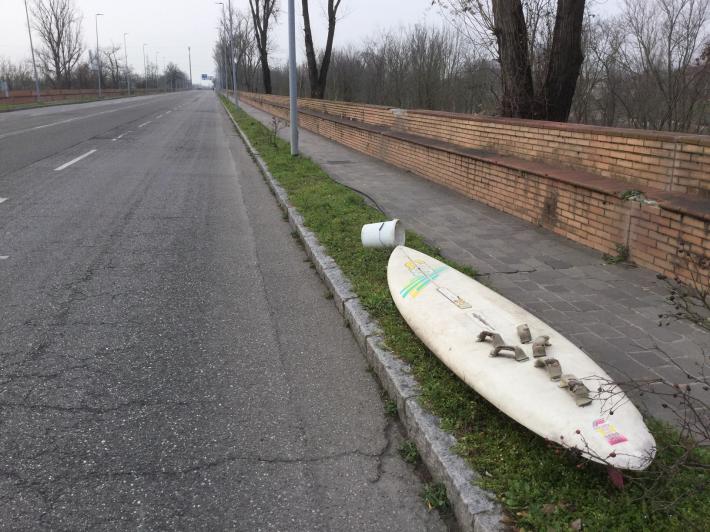 L'inciviltà di certa gente non conosce limiti, ma in questo caso diventa quasi comica: un lettore ci ha inviato queste foto di una tavola da surf abbandonata sul lungo Parma. Ed essendo un mercoledì il riferimento cinematografico scatta immediato: "Un mercoledì da leoni"!