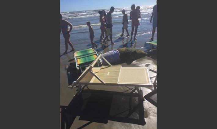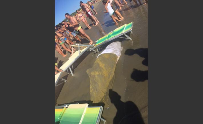 Dopo la forte mareggiata di stanotte un delfino è' stato ritrovato morto in spiaggia a Cervia