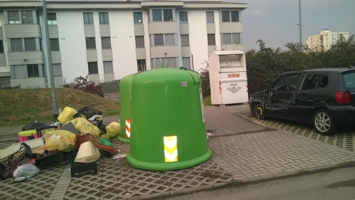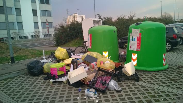 Sono una residente di via Giovanni Spadolini dal 2010 e da allora assisto all'insopportabile spettacolo di cumuli di rifiuti abbandonati in questa via. Allego alcune foto scattate proprio oggi, che illustrano la consueta situazione accanto alle campane per la raccolta del vetro.