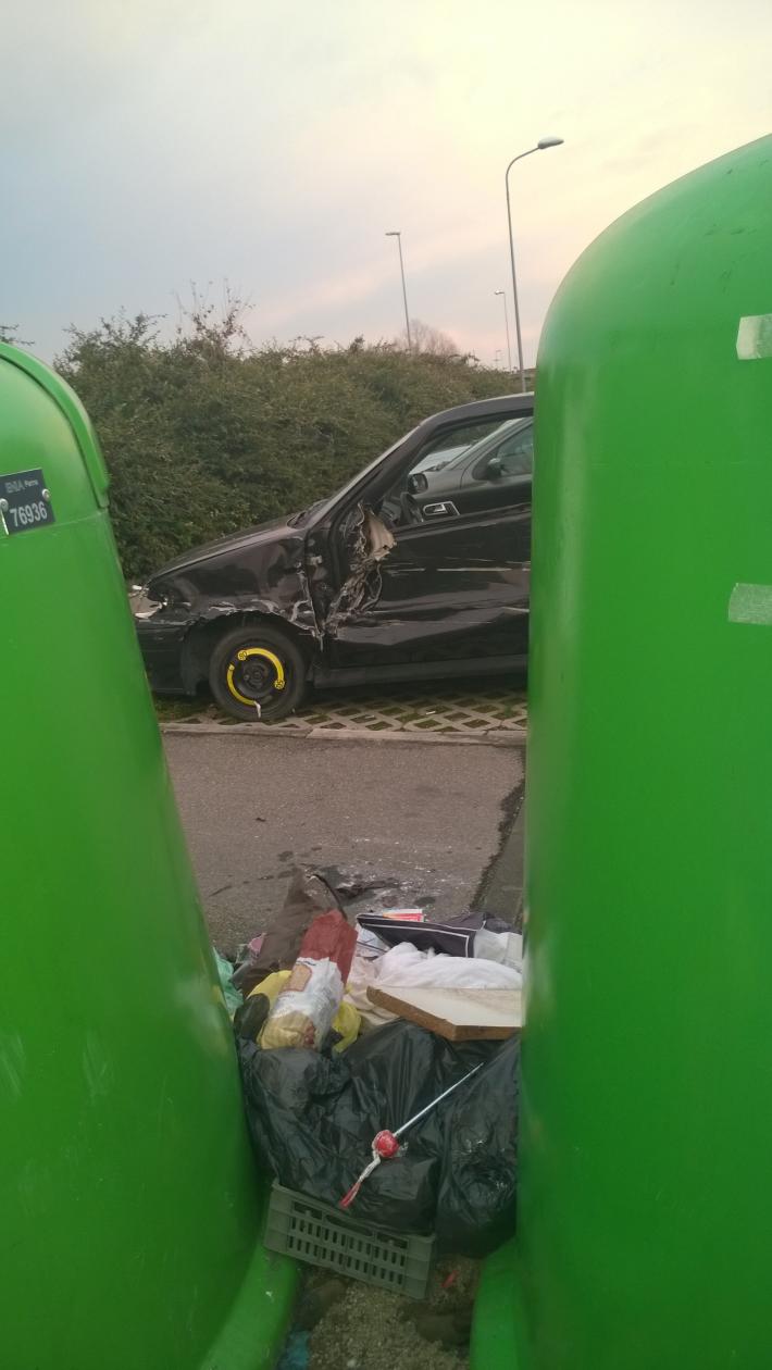 La discarica si sta convertendo anche in sfascia carrozze, comprende un'auto incidentata (non assicurata) depositata sempre accanto alle campane da non so più quanto tempo.