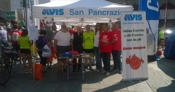 Gazebo Avis alla Cariparma Running 2018. Nella foto il Presidente Izzi con i volontari ed il Sindaco Pizzarotti