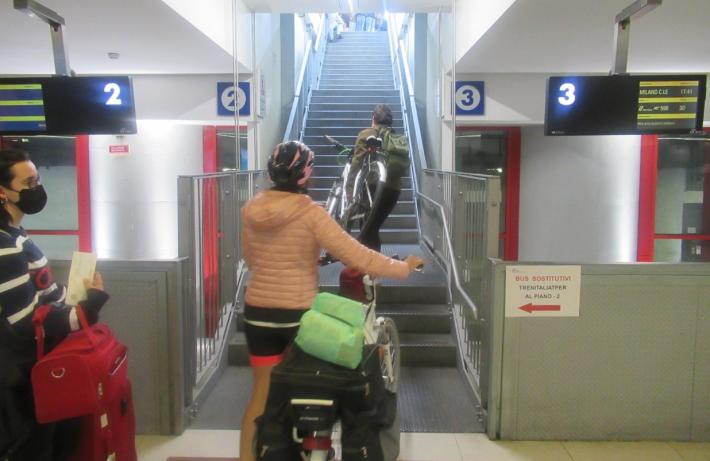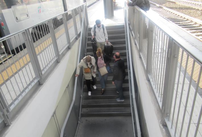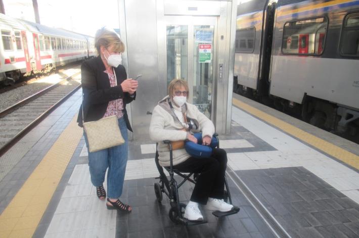 «L'ascenseur est en panne», farfuglia non molto contenta una ragazza francese, scendendo la scala con la bicicletta in spalla. Ed è in evidente difficoltà anche una signora inglese appena scesa da un Frecciarossa, su una seggiola a rotelle.