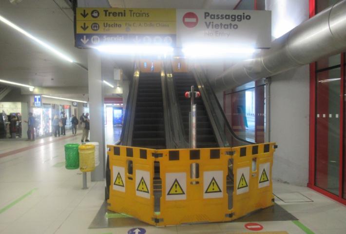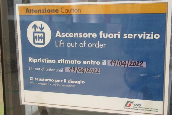 Alla stazione ferroviaria sono ancora fuori uso i due ascensori che collegano il sottopassaggio principale ai binari dal 2 al 5, ovvero i binari dove fermano i treni più importanti. Per raggiungere i binari non rimane altro da fare che utilizzare le scale (fisse, non mobili). Sui due ascensori, bloccati da qualche settimana, compare la scritta «Ascensore fuori servizio. Ripristino stimato entro il 19/04/2022», cioè oggi. Ma alle 18.30 non c’era traccia di «lavori in corso». Per di più erano ferme anche le due scale mobili che collegano il piano -1 al piano -2. Gli ascensori guasti comportano disagi in primo luogo alle persone disabili, ma anche alle persone con valigie pesanti e comunque alle persone che hanno difficoltà a salire e scendere le scale. Per le