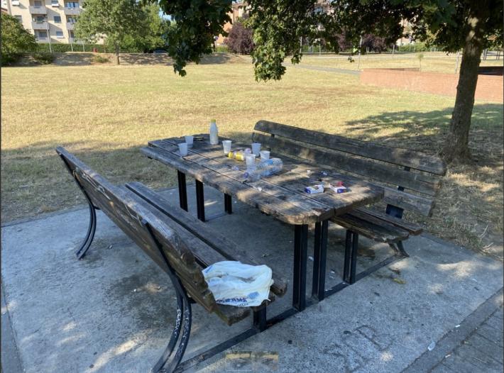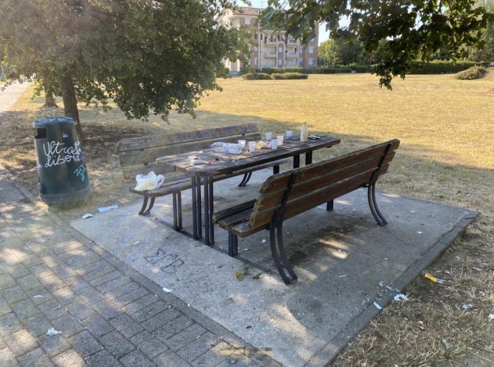 "Questo è lo scempio che quasi tutte le mattine si può ammirare passeggiando nell'area verde fra Via Sanremo e Via Portofino. Panchine divelte, rifiuti, bottiglie rotte....", segnala il lettore Marco.