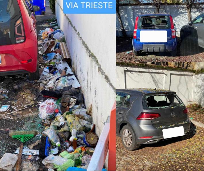 Immondizia sparsa sui marciapiedi e auto vandalizzate: così si presenta via Trieste in queste foto che hanno spinto il consigliere Pd Marco Alfredo Arcidiacono a chiedere spiegazioni alla Giunta.