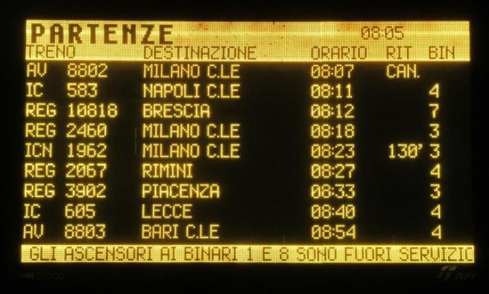 Passiamo alle notizie cattive: il treno Frecciarossa Ancona-Milano delle 8.07, comodo per i parmigiani per arrivare «presto e bene» nel capoluogo lombardo, è cancellato. L’Intercity Notte proveniente da Palermo e Siracusa, previsto in partenza per Milano alle 8.23, è in ritardo di 130 minuti, ovvero due ore e dieci minuti. E sono annunciati «fuori servizio» gli ascensori ai binari 1 e 8.