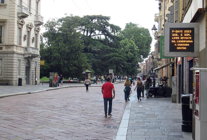 Il sabato pomeriggio e la domenica in via Garibaldi i bus transitano come di consueto: la linea 1 in entrambi i giorni e la linea 15 solo il sabato. I «P-Days», che prevedono la pedonalizzazione di via Mazzini e di via Repubblica ogni sabato dalle 14.30 alle 23 e ogni domenica dalle 9 alle 20, coinvolgono le linee 3-4-5-8 che vengono deviate sul Lungoparma.