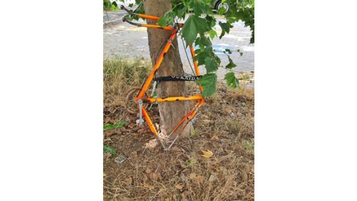 In questa foto di Massimo Mari, l'ennesimo episodio di inciviltà: una bicicletta "cannibalizzata" rimasta solo con il telaio ma ancora fissata all'albero del piazzale.