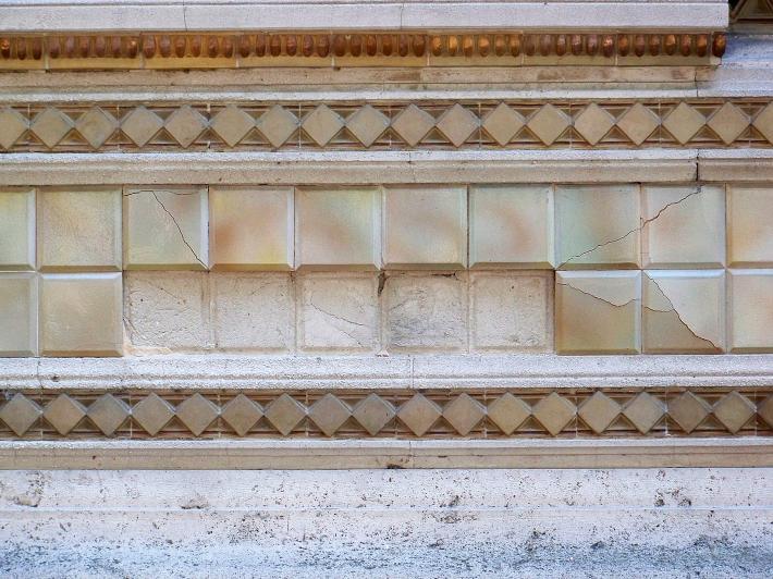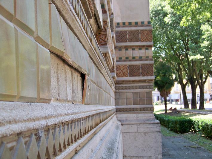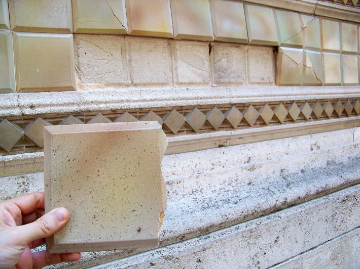 "Mentre a Salsomaggiore è aperta la mostra su Galileo Chini - ci scrive un lettore -, ecco sul lato delle Terme Berzieri alcune piastrelle decorative (uscite dalle fornaci Chini di Borgo san Lorenzo) cascate dalla parete e distrutte per terra".