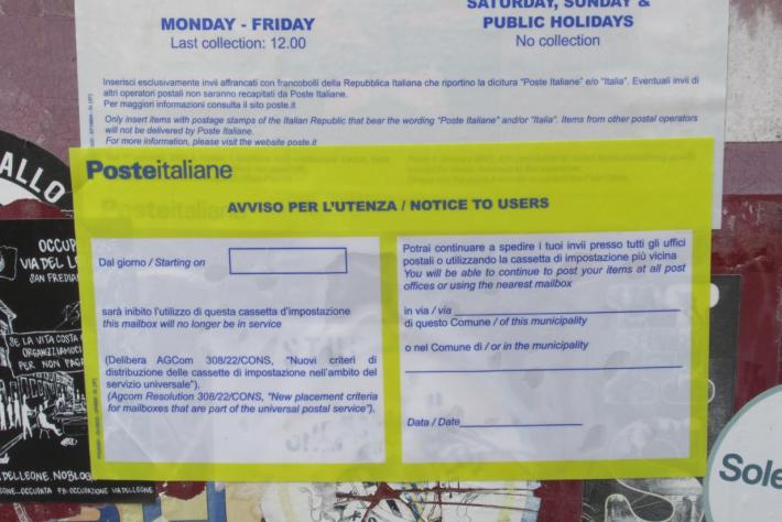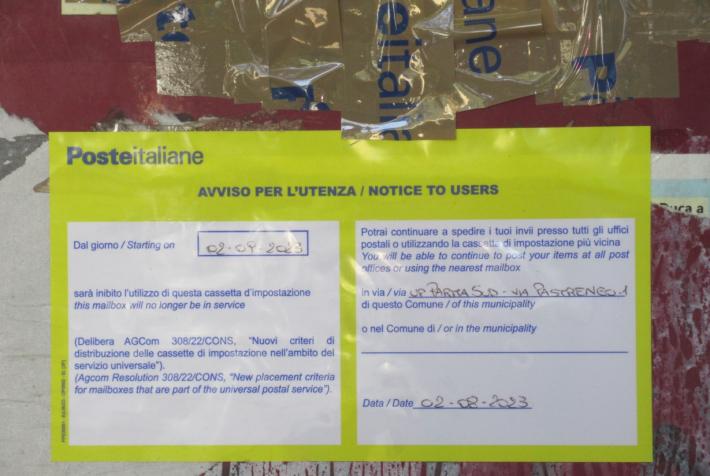 Che fare, quindi, con una lettera da spedire? L’avviso sulla cassetta prosegue così: «Potrai continuare a spedire i tuoi invii presso tutti gli uffici postali o utilizzando la cassetta di impostazione più vicina in via ........ o nel Comune di ........».