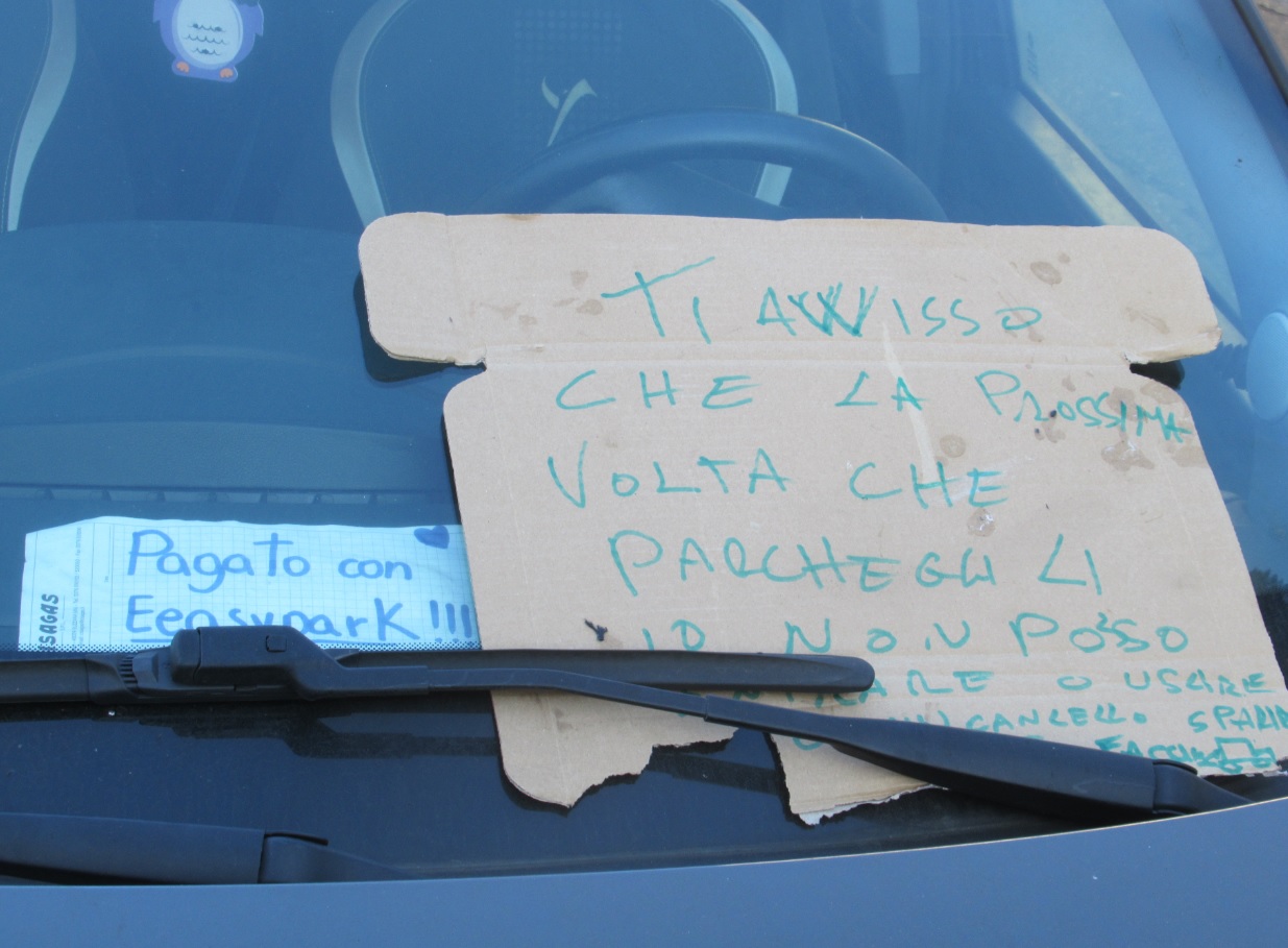 «Pagato con Eeasypark!!!» e una scritta su cartone sotto il tergicristallo che indica l’impossibilità, per chi abita di fronte, di uscire dal cancello con l’auto perché questa utilitaria è parcheggiata dove non dovrebbe.