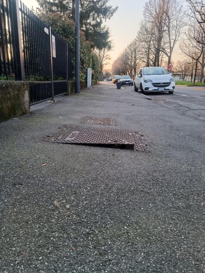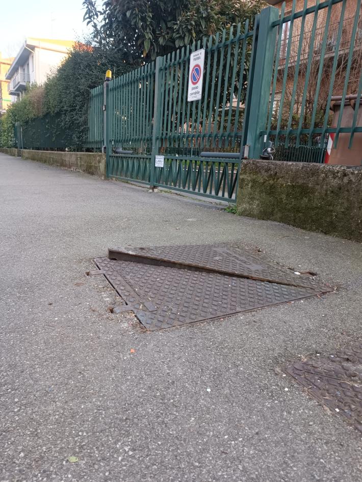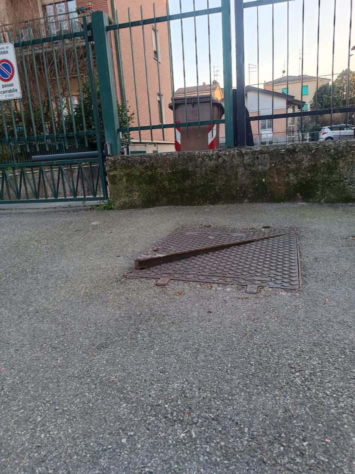Pericolo: tombino sollevato sul marciapiede in via Ognibene
